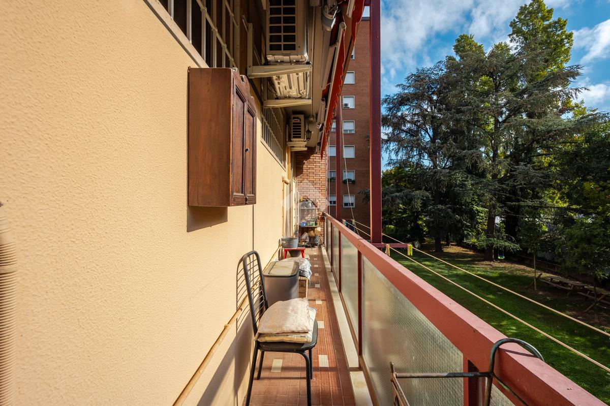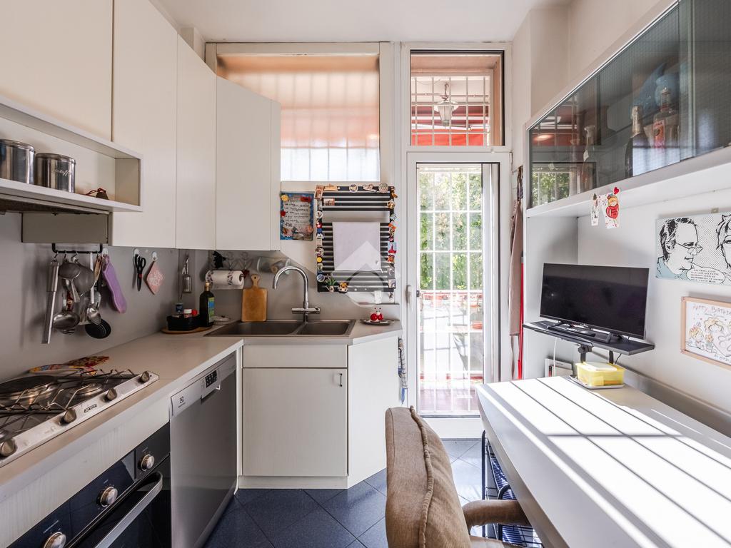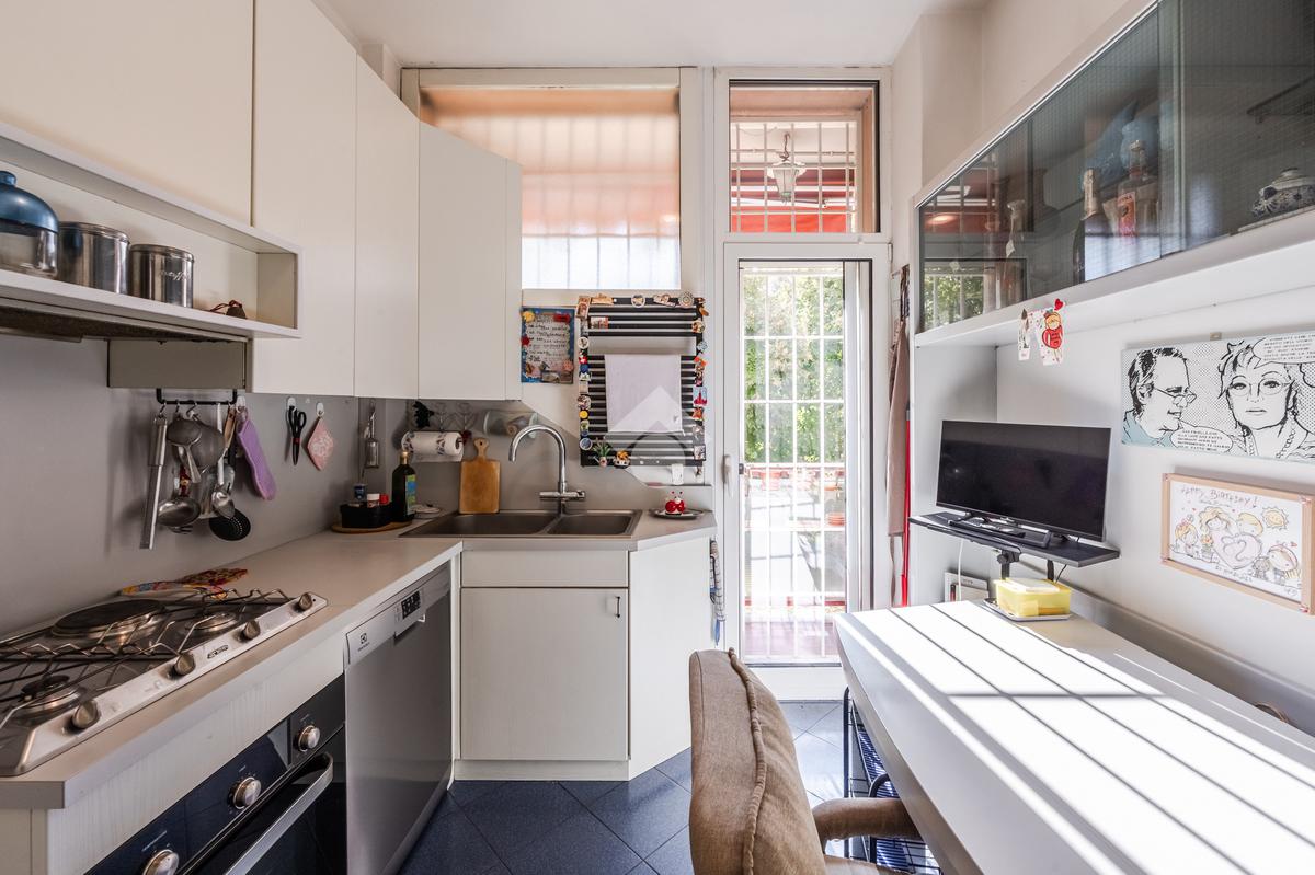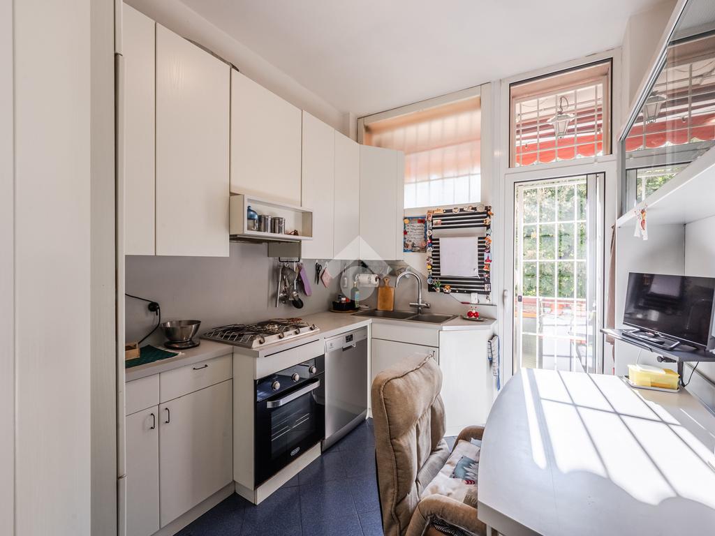 La compoisizione dell'immobile prevede un ingresso arredabile, che disimpegna la sala molto luminosa, grazie alle sue ampie finestrature, che danno un grande apporto in termini di luminosità e ventilazione naturale. La cucina è semi abitabile ed ha un accesso al terrazzino, da cui si godono dei gradevoli affacci interni sul curato giardino condominiale.