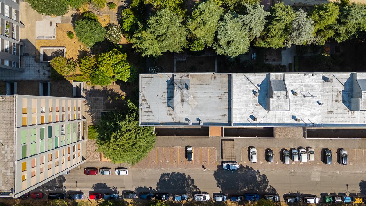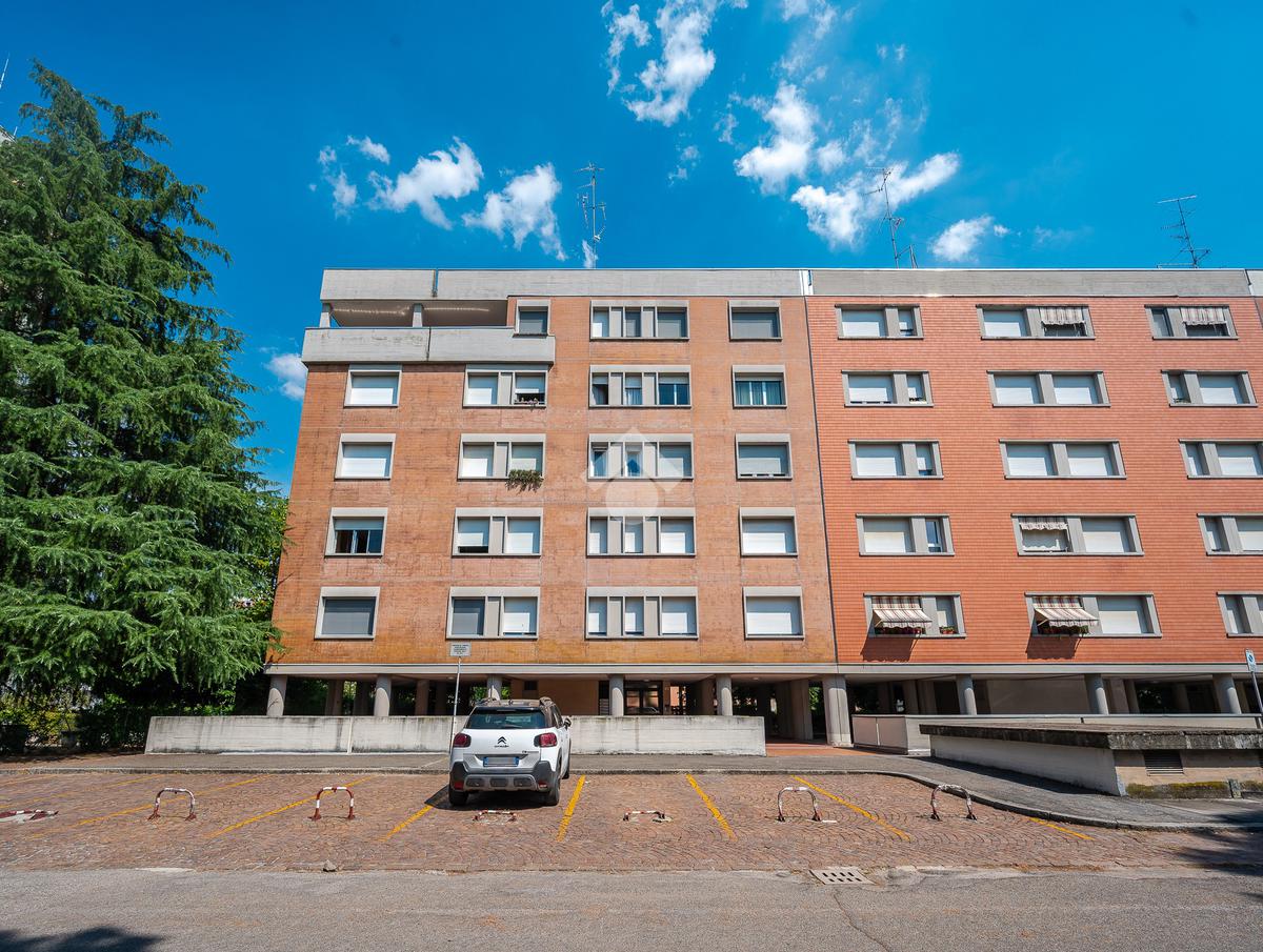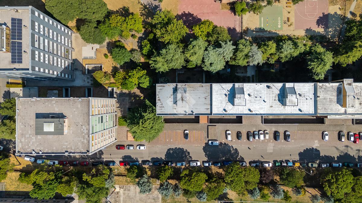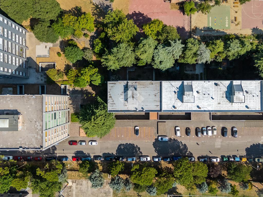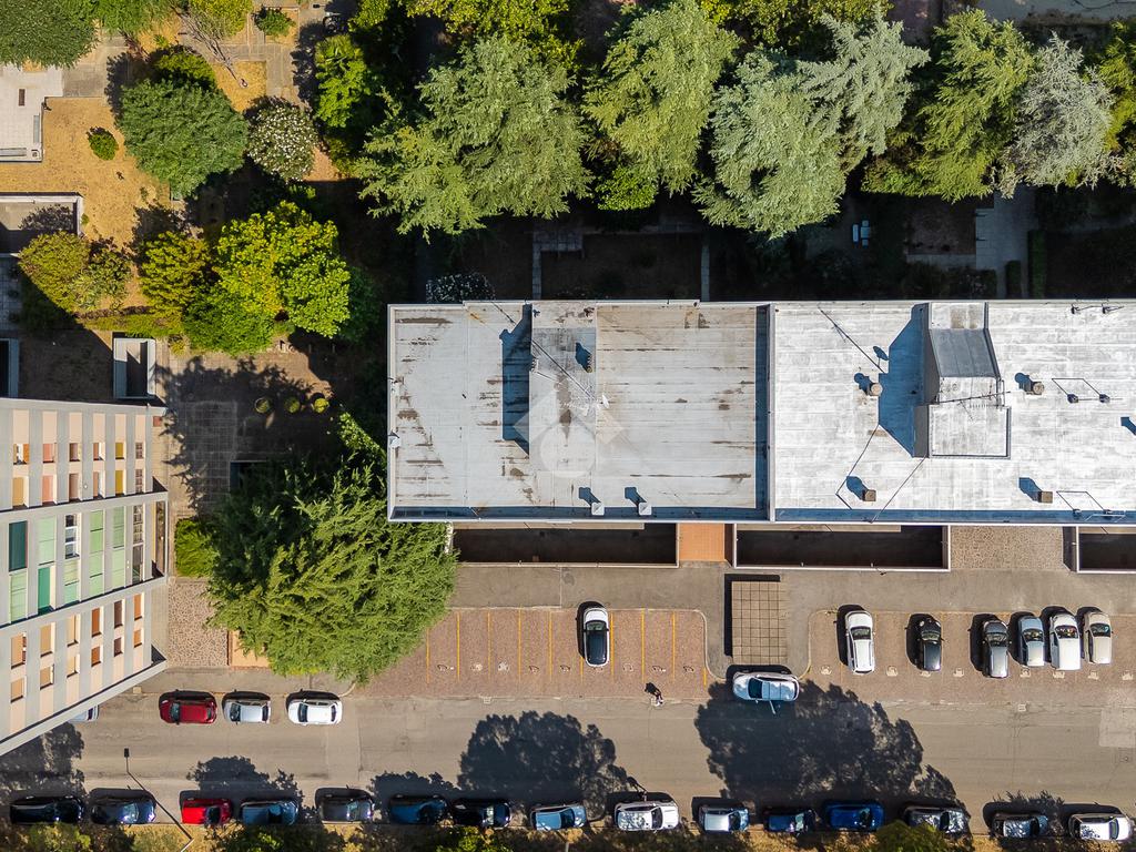 Frontale all'ingresso del palazzo, troviamo un comodo parcheggio per le auto, dove è possibile parcheggiare un veicolo per ogni condomino.